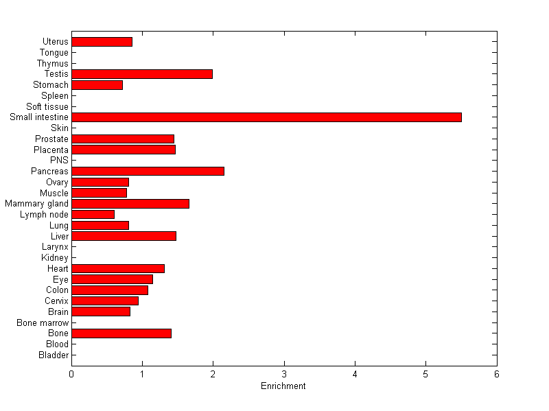The expression level is normalized with tissue-library size. Each value for a gene in a tissue is a ratio of observed ESTs to the expected one in this tissue. The expected number of ESTs is the product of total ESTs of the gene and the fraction of total ESTs in the tissue among all ESTs in 30 tissues.