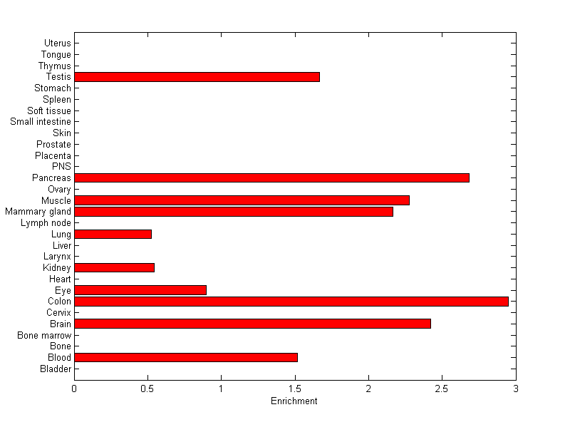 The expression level is normalized with tissue-library size. Each value for a gene in a tissue is a ratio of observed ESTs to the expected one in this tissue. The expected number of ESTs is the product of total ESTs of the gene and the fraction of total ESTs in the tissue among all ESTs in 30 tissues.