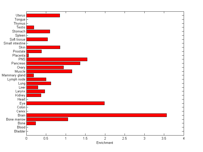 The expression level is normalized with tissue-library size. Each value for a gene in a tissue is a ratio of observed ESTs to the expected one in this tissue. The expected number of ESTs is the product of total ESTs of the gene and the fraction of total ESTs in the tissue among all ESTs in 30 tissues.