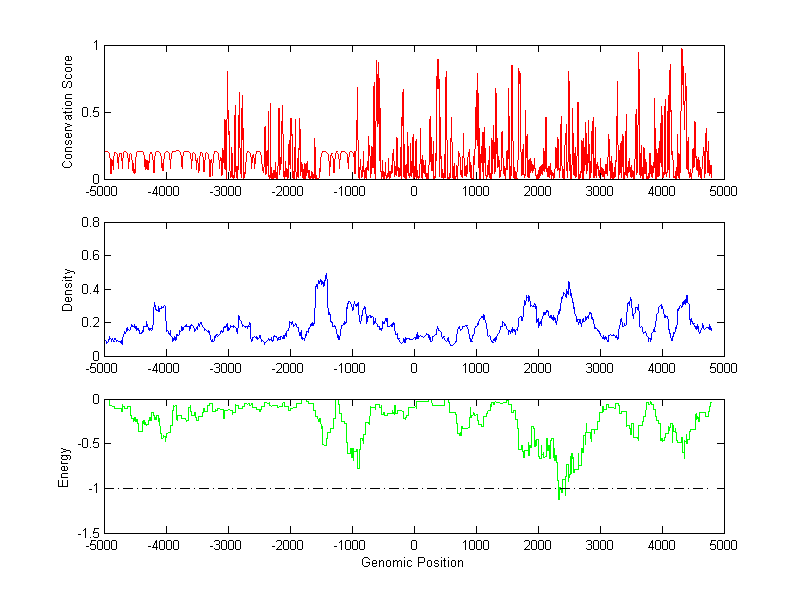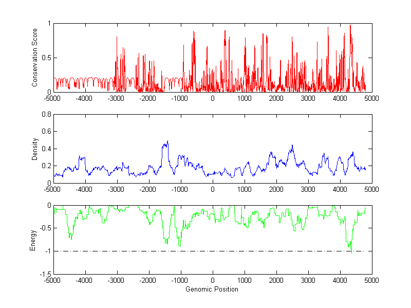 About the profiles: The conservation profile (red curve) is about conservation scores of the promoter sequences. Conservation was determined from an eight-way alignment of human, chimpanzee, dog, mouse, rat, chicken, zebrafish and fugu sequences. The conservation was quantified by a conservation score between 0 and 1, with 1 as highest conservation. The conservation score was obtained from UCSC genome databases. The density profile (blue curve) is about density of all TF binding sites. The energy profile (green curve) is about energy for module detection based on TF interaction. The positions with energy less than -1 indicate the existence of CRMs. Download: Conservation profileDensity profile Energy profile CRM summary |
