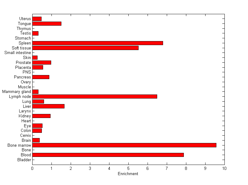 About the profile: The expression level is normalized with tissue-library size. Each value for a gene in a tissue is a ratio of observed ESTs to the expected one in this tissue. The expected number of ESTs is the product of total ESTs of the gene and the fraction of total ESTs in the tissue among all ESTs in 30 tissues. Summary: This gene is preferentially expressed in [blood, bone_marrow, lymph_node] Download: |