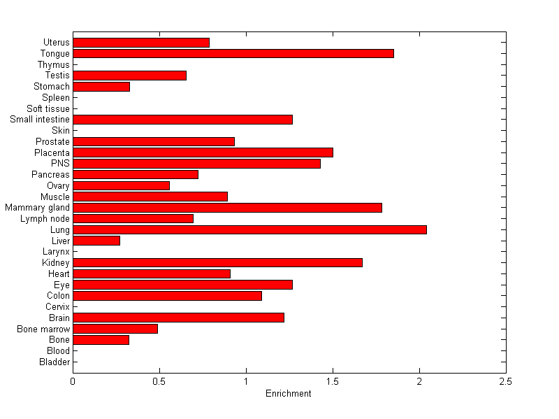 The expression level is normalized with tissue-library size. Each value for a gene in a tissue is a ratio of observed ESTs to the expected one in this tissue. The expected number of ESTs is the product of total ESTs of the gene and the fraction of total ESTs in the tissue among all ESTs in 30 tissues.