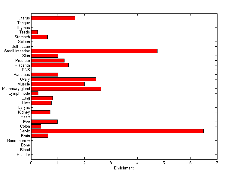 The expression level is normalized with tissue-library size. Each value for a gene in a tissue is a ratio of observed ESTs to the expected one in this tissue. The expected number of ESTs is the product of total ESTs of the gene and the fraction of total ESTs in the tissue among all ESTs in 30 tissues.