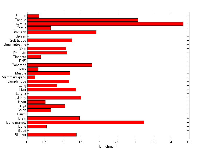 The expression level is normalized with tissue-library size. Each value for a gene in a tissue is a ratio of observed ESTs to the expected one in this tissue. The expected number of ESTs is the product of total ESTs of the gene and the fraction of total ESTs in the tissue among all ESTs in 30 tissues.