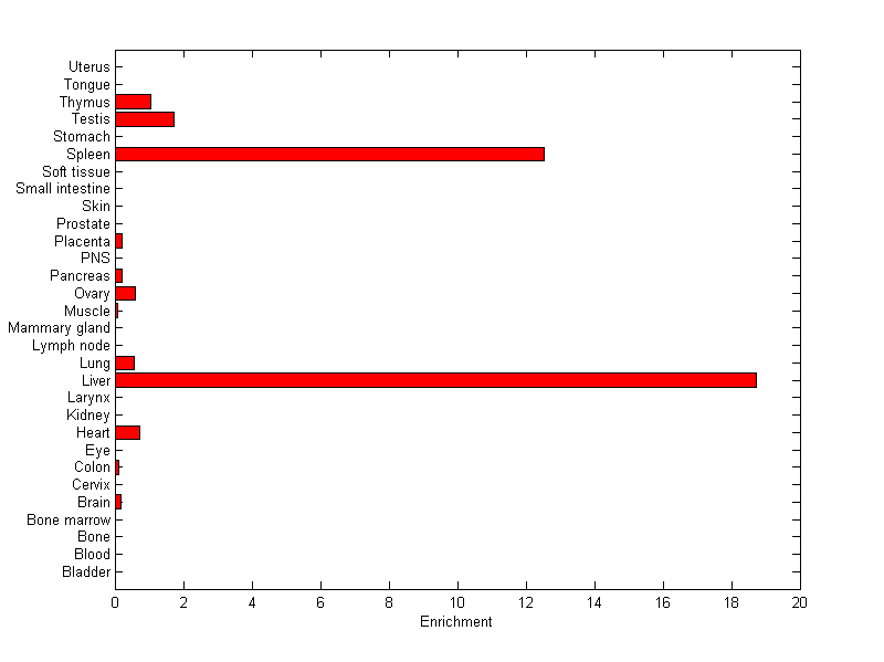 The expression level is normalized with tissue-library size. Each value for a gene in a tissue is a ratio of observed ESTs to the expected one in this tissue. The expected number of ESTs is the product of total ESTs of the gene and the fraction of total ESTs in the tissue among all ESTs in 30 tissues.