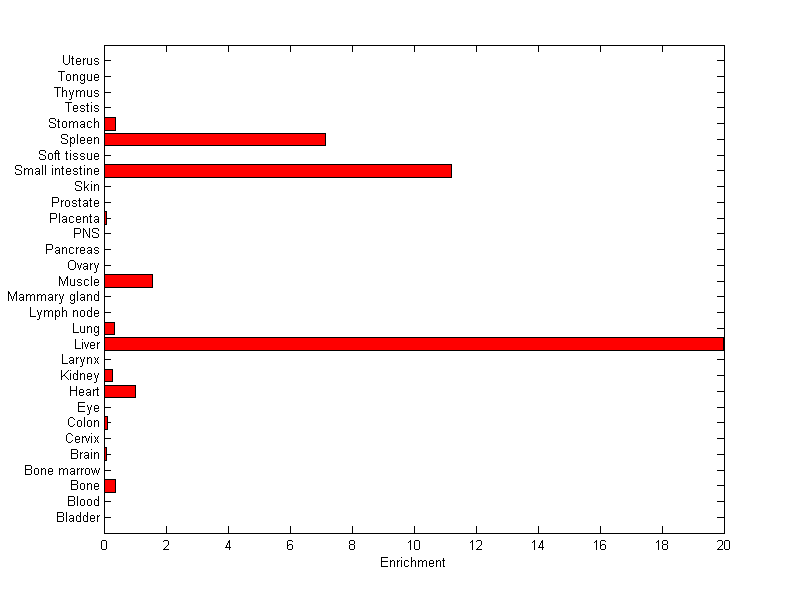 About the profile: The expression level is normalized with tissue-library size. Each value for a gene in a tissue is a ratio of observed ESTs to the expected one in this tissue. The expected number of ESTs is the product of total ESTs of the gene and the fraction of total ESTs in the tissue among all ESTs in 30 tissues. Summary: This gene is preferentially expressed in [liver, small_intestine, spleen] Download: |