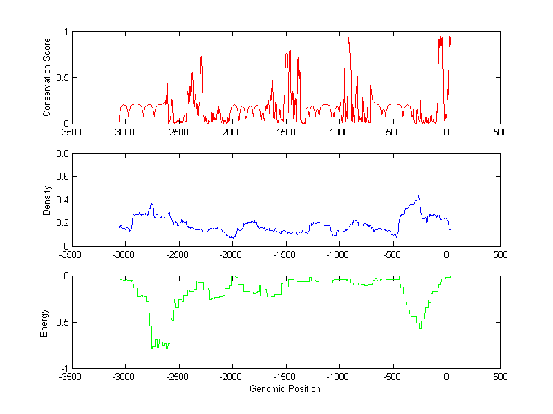 The conservation profile (red curve) is about conservation scores of the promoter sequences. Conservation was determined from an eight-way alignment of human, chimpanzee, dog, mouse, rat, chicken, zebrafish and fugu sequences. The conservation was quantified by a conservation score between 0 and 1, with 1 as highest conservation. The conservation score was obtained from UCSC genome databases.