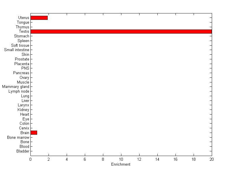 The expression level is normalized with tissue-library size. Each value for a gene in a tissue is a ratio of observed ESTs to the expected one in this tissue. The expected number of ESTs is the product of total ESTs of the gene and the fraction of total ESTs in the tissue among all ESTs in 30 tissues.