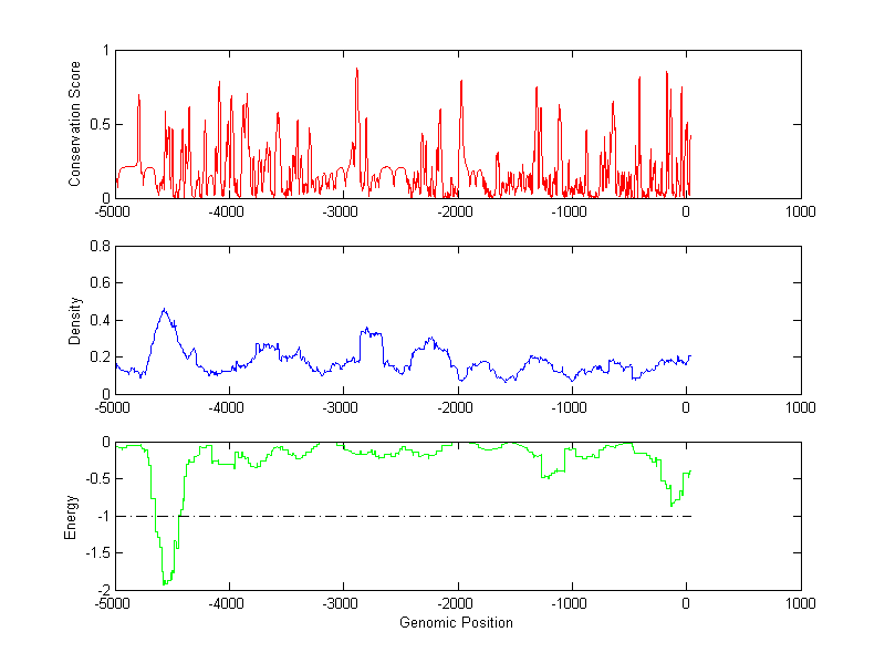 The energy profile (green curve) is about energy for module detection based on TF interaction. The positions with energy less than -1 indicate the existence of CRMs.