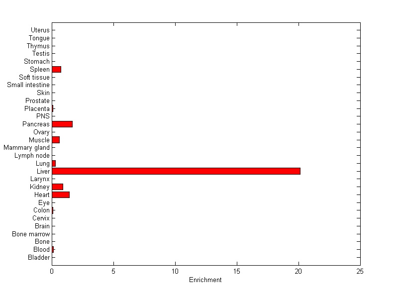 The expression level is normalized with tissue-library size. Each value for a gene in a tissue is a ratio of observed ESTs to the expected one in this tissue. The expected number of ESTs is the product of total ESTs of the gene and the fraction of total ESTs in the tissue among all ESTs in 30 tissues.