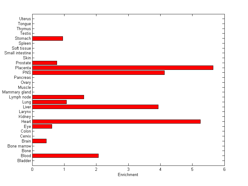 The expression level is normalized with tissue-library size. Each value for a gene in a tissue is a ratio of observed ESTs to the expected one in this tissue. The expected number of ESTs is the product of total ESTs of the gene and the fraction of total ESTs in the tissue among all ESTs in 30 tissues.