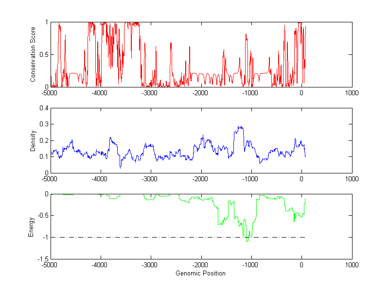 The energy profile (green curve) is about energy for module detection based on TF interaction. The positions with energy less than -1 indicate the existence of CRMs.