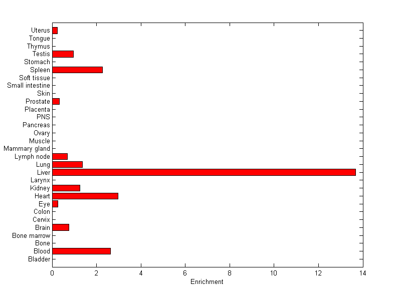The expression level is normalized with tissue-library size. Each value for a gene in a tissue is a ratio of observed ESTs to the expected one in this tissue. The expected number of ESTs is the product of total ESTs of the gene and the fraction of total ESTs in the tissue among all ESTs in 30 tissues.