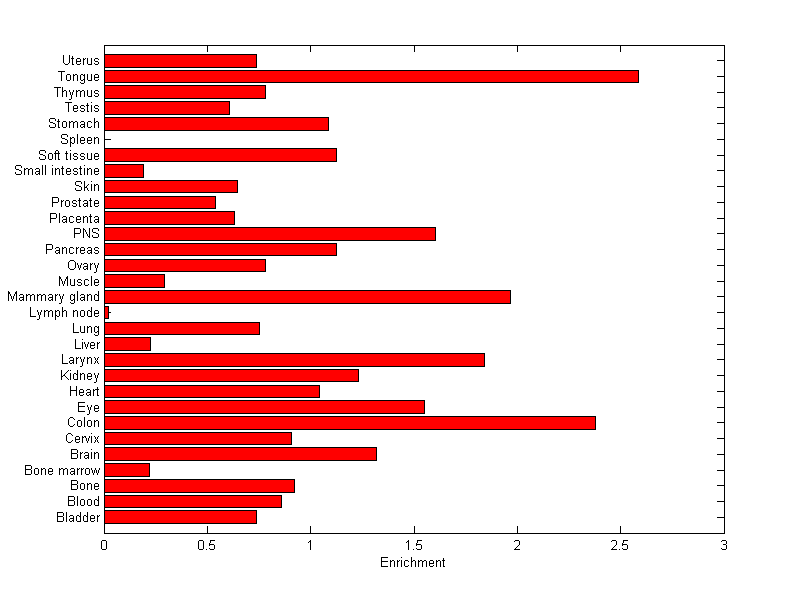 The expression level is normalized with tissue-library size. Each value for a gene in a tissue is a ratio of observed ESTs to the expected one in this tissue. The expected number of ESTs is the product of total ESTs of the gene and the fraction of total ESTs in the tissue among all ESTs in 30 tissues.