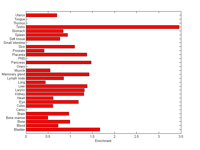 The expression level is normalized with tissue-library size. Each value for a gene in a tissue is a ratio of observed ESTs to the expected one in this tissue. The expected number of ESTs is the product of total ESTs of the gene and the fraction of total ESTs in the tissue among all ESTs in 30 tissues.
