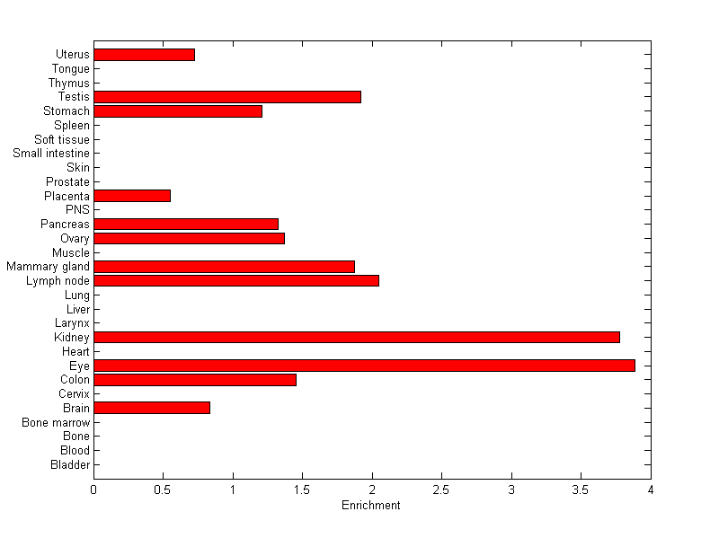 The expression level is normalized with tissue-library size. Each value for a gene in a tissue is a ratio of observed ESTs to the expected one in this tissue. The expected number of ESTs is the product of total ESTs of the gene and the fraction of total ESTs in the tissue among all ESTs in 30 tissues.