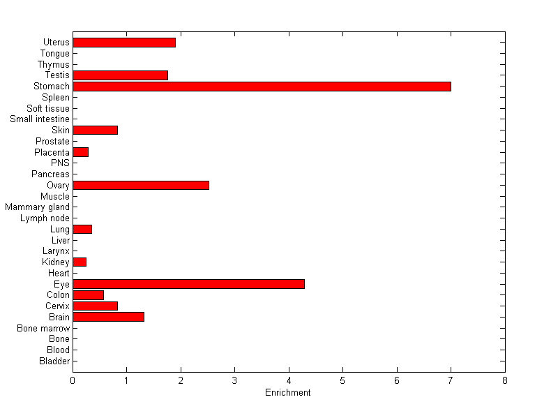 The expression level is normalized with tissue-library size. Each value for a gene in a tissue is a ratio of observed ESTs to the expected one in this tissue. The expected number of ESTs is the product of total ESTs of the gene and the fraction of total ESTs in the tissue among all ESTs in 30 tissues.