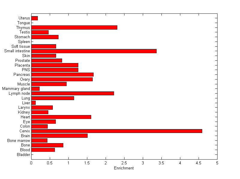 The expression level is normalized with tissue-library size. Each value for a gene in a tissue is a ratio of observed ESTs to the expected one in this tissue. The expected number of ESTs is the product of total ESTs of the gene and the fraction of total ESTs in the tissue among all ESTs in 30 tissues.