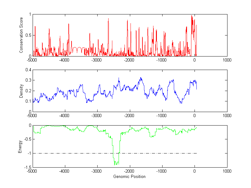 About the profiles: The conservation profile (red curve) is about conservation scores of the promoter sequences. Conservation was determined from an eight-way alignment of human, chimpanzee, dog, mouse, rat, chicken, zebrafish and fugu sequences. The conservation was quantified by a conservation score between 0 and 1, with 1 as highest conservation. The conservation score was obtained from UCSC genome databases. The density profile (blue curve) is about density of all TF binding sites. The energy profile (green curve) is about energy for module detection based on TF interaction. The positions with energy less than -1 indicate the existence of CRMs. Download: Conservation profileDensity profile Energy profile CRM summary |