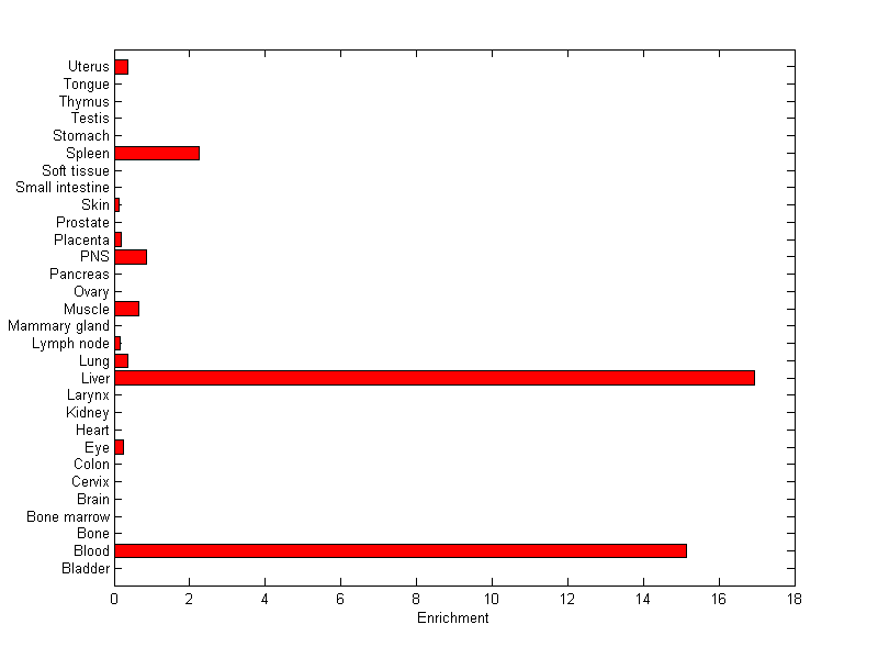 About the profile: The expression level is normalized with tissue-library size. Each value for a gene in a tissue is a ratio of observed ESTs to the expected one in this tissue. The expected number of ESTs is the product of total ESTs of the gene and the fraction of total ESTs in the tissue among all ESTs in 30 tissues. Summary: This gene is preferentially expressed in [blood, liver] Download: |