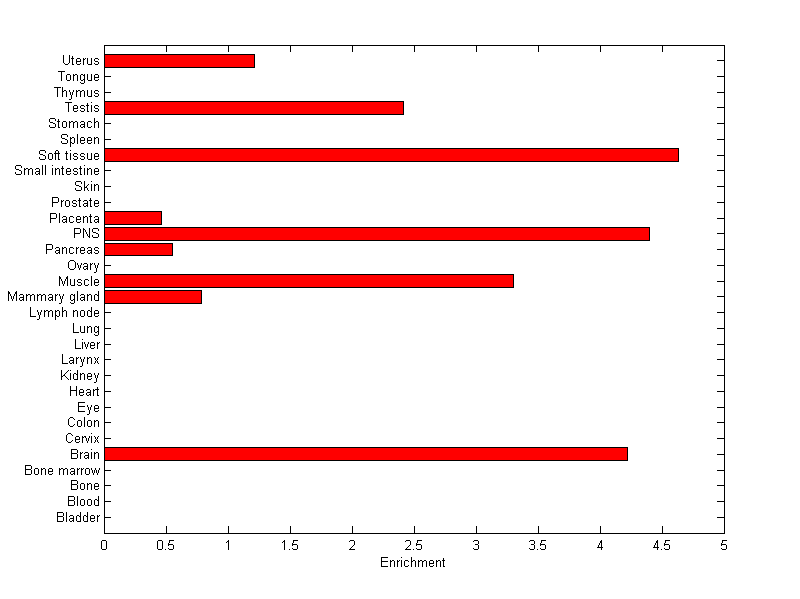 The expression level is normalized with tissue-library size. Each value for a gene in a tissue is a ratio of observed ESTs to the expected one in this tissue. The expected number of ESTs is the product of total ESTs of the gene and the fraction of total ESTs in the tissue among all ESTs in 30 tissues.