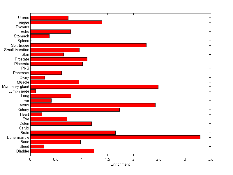 The expression level is normalized with tissue-library size. Each value for a gene in a tissue is a ratio of observed ESTs to the expected one in this tissue. The expected number of ESTs is the product of total ESTs of the gene and the fraction of total ESTs in the tissue among all ESTs in 30 tissues.
