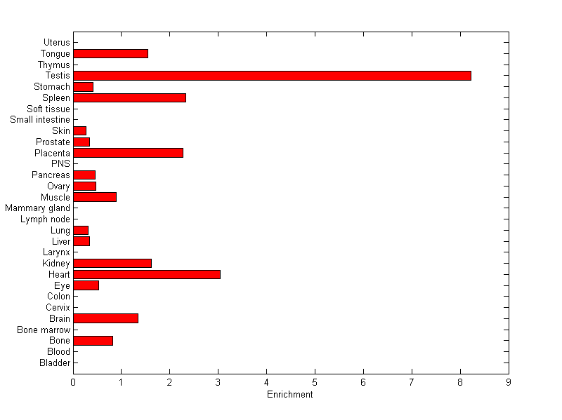 The expression level is normalized with tissue-library size. Each value for a gene in a tissue is a ratio of observed ESTs to the expected one in this tissue. The expected number of ESTs is the product of total ESTs of the gene and the fraction of total ESTs in the tissue among all ESTs in 30 tissues.