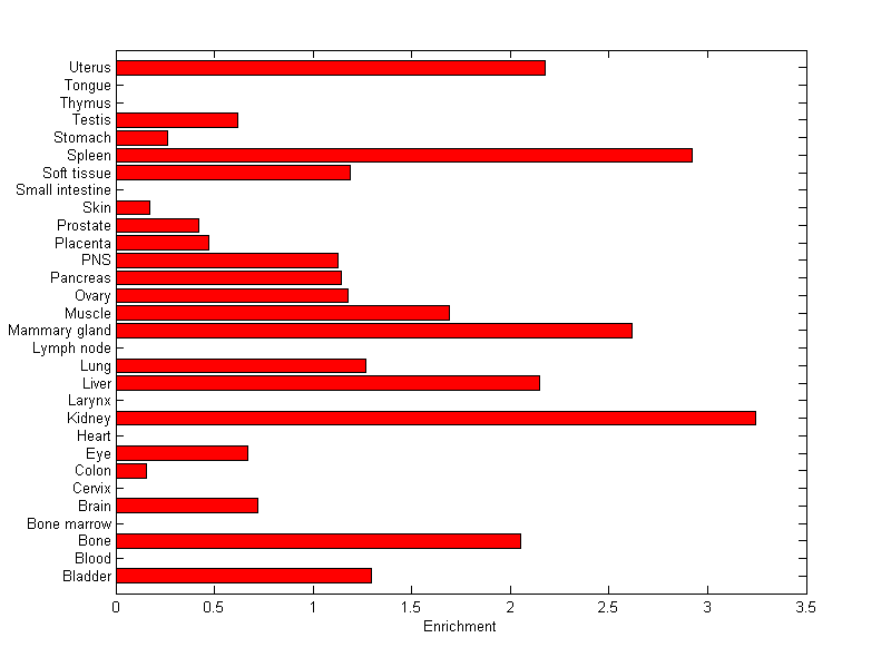 The expression level is normalized with tissue-library size. Each value for a gene in a tissue is a ratio of observed ESTs to the expected one in this tissue. The expected number of ESTs is the product of total ESTs of the gene and the fraction of total ESTs in the tissue among all ESTs in 30 tissues.