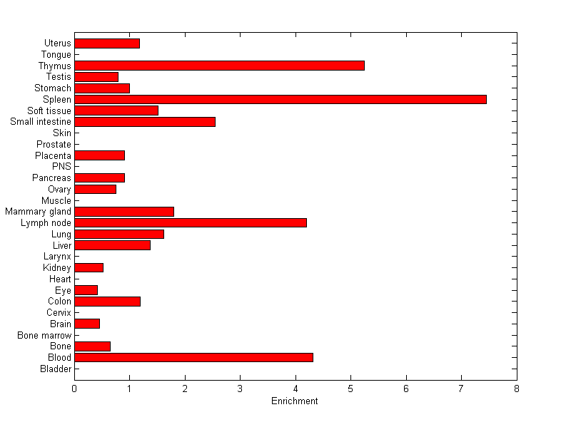The expression level is normalized with tissue-library size. Each value for a gene in a tissue is a ratio of observed ESTs to the expected one in this tissue. The expected number of ESTs is the product of total ESTs of the gene and the fraction of total ESTs in the tissue among all ESTs in 30 tissues.