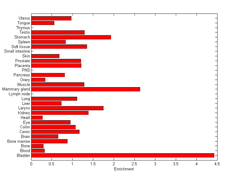 The expression level is normalized with tissue-library size. Each value for a gene in a tissue is a ratio of observed ESTs to the expected one in this tissue. The expected number of ESTs is the product of total ESTs of the gene and the fraction of total ESTs in the tissue among all ESTs in 30 tissues.