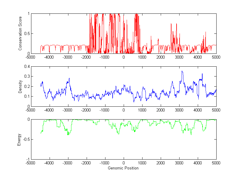 The energy profile (green curve) is about energy for module detection based on TF interaction. The positions with energy less than -1 indicate the existence of CRMs.