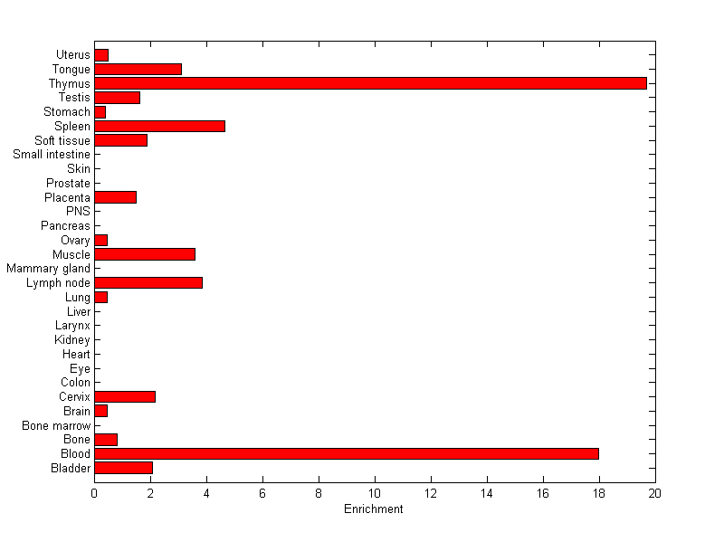 The expression level is normalized with tissue-library size. Each value for a gene in a tissue is a ratio of observed ESTs to the expected one in this tissue. The expected number of ESTs is the product of total ESTs of the gene and the fraction of total ESTs in the tissue among all ESTs in 30 tissues.