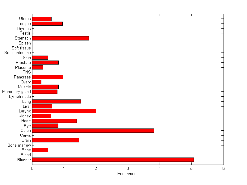 The expression level is normalized with tissue-library size. Each value for a gene in a tissue is a ratio of observed ESTs to the expected one in this tissue. The expected number of ESTs is the product of total ESTs of the gene and the fraction of total ESTs in the tissue among all ESTs in 30 tissues.