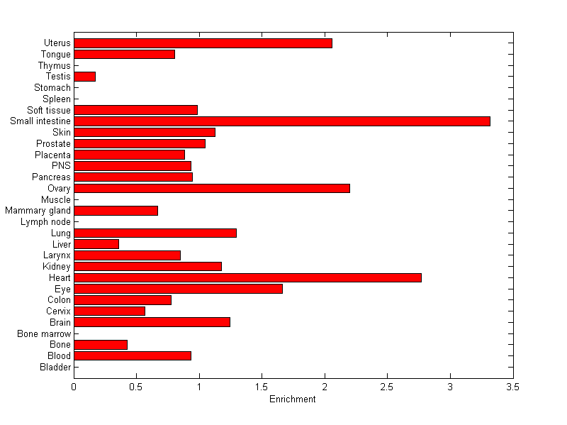The expression level is normalized with tissue-library size. Each value for a gene in a tissue is a ratio of observed ESTs to the expected one in this tissue. The expected number of ESTs is the product of total ESTs of the gene and the fraction of total ESTs in the tissue among all ESTs in 30 tissues.