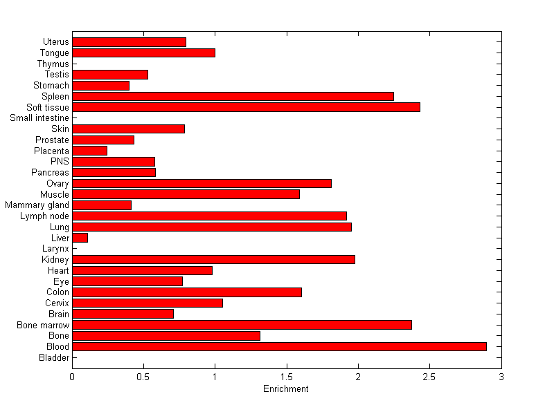 The expression level is normalized with tissue-library size. Each value for a gene in a tissue is a ratio of observed ESTs to the expected one in this tissue. The expected number of ESTs is the product of total ESTs of the gene and the fraction of total ESTs in the tissue among all ESTs in 30 tissues.