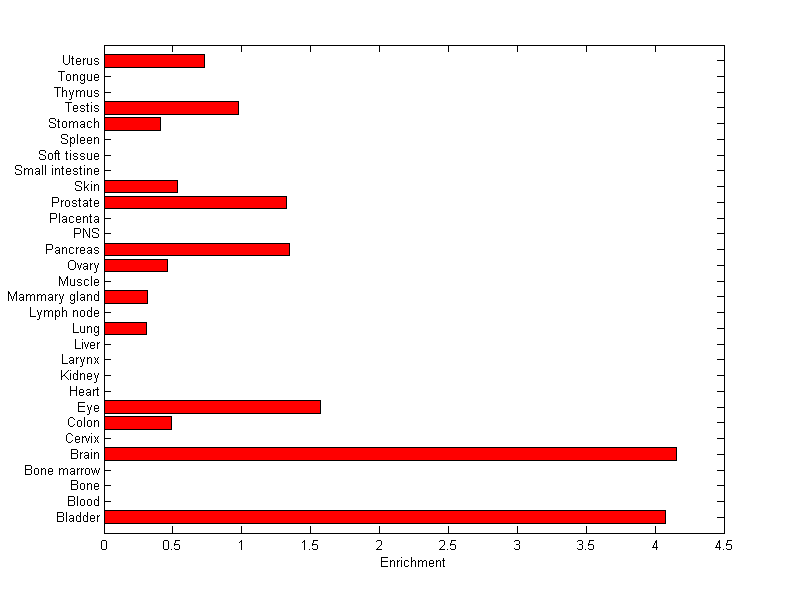 The expression level is normalized with tissue-library size. Each value for a gene in a tissue is a ratio of observed ESTs to the expected one in this tissue. The expected number of ESTs is the product of total ESTs of the gene and the fraction of total ESTs in the tissue among all ESTs in 30 tissues.