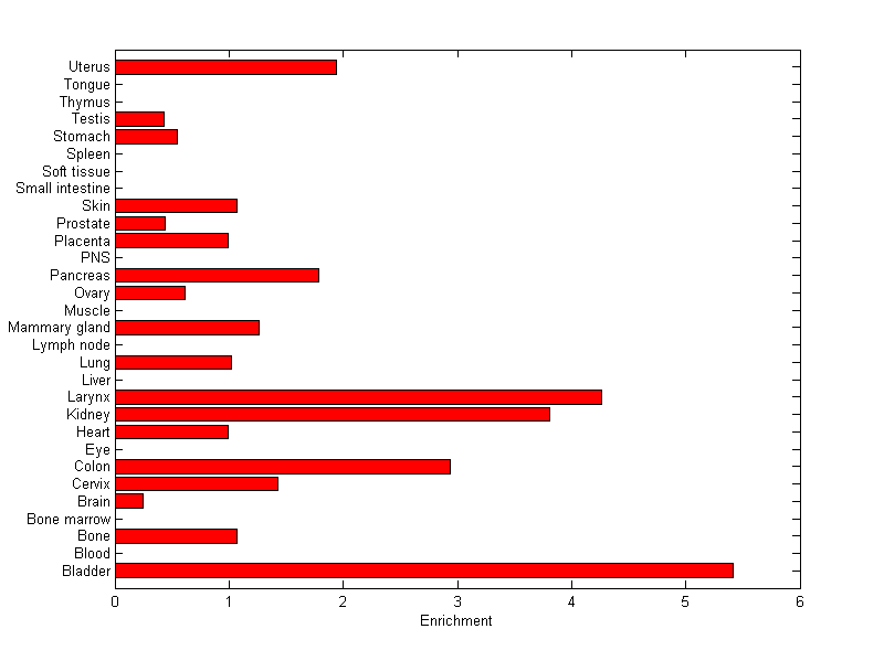 The expression level is normalized with tissue-library size. Each value for a gene in a tissue is a ratio of observed ESTs to the expected one in this tissue. The expected number of ESTs is the product of total ESTs of the gene and the fraction of total ESTs in the tissue among all ESTs in 30 tissues.