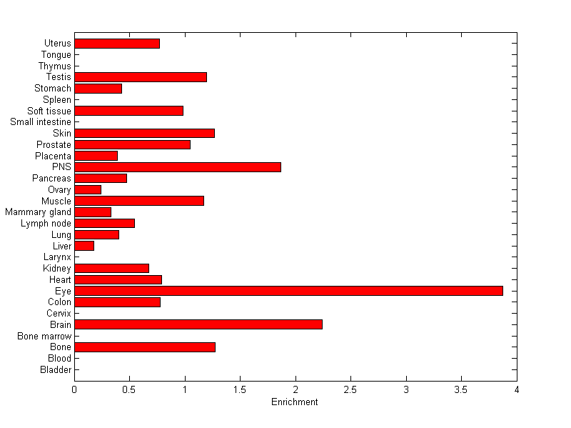 The expression level is normalized with tissue-library size. Each value for a gene in a tissue is a ratio of observed ESTs to the expected one in this tissue. The expected number of ESTs is the product of total ESTs of the gene and the fraction of total ESTs in the tissue among all ESTs in 30 tissues.