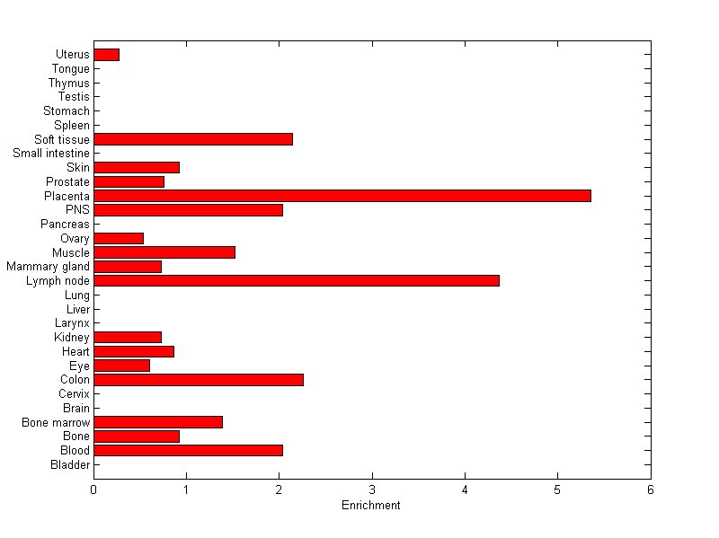 The expression level is normalized with tissue-library size. Each value for a gene in a tissue is a ratio of observed ESTs to the expected one in this tissue. The expected number of ESTs is the product of total ESTs of the gene and the fraction of total ESTs in the tissue among all ESTs in 30 tissues.