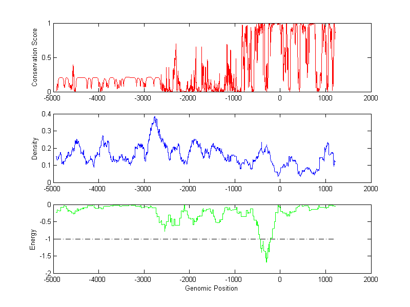 The energy profile (green curve) is about energy for module detection based on TF interaction. The positions with energy less than -1 indicate the existence of CRMs.