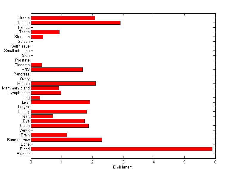 The expression level is normalized with tissue-library size. Each value for a gene in a tissue is a ratio of observed ESTs to the expected one in this tissue. The expected number of ESTs is the product of total ESTs of the gene and the fraction of total ESTs in the tissue among all ESTs in 30 tissues.