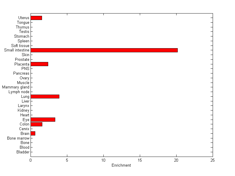 The expression level is normalized with tissue-library size. Each value for a gene in a tissue is a ratio of observed ESTs to the expected one in this tissue. The expected number of ESTs is the product of total ESTs of the gene and the fraction of total ESTs in the tissue among all ESTs in 30 tissues.