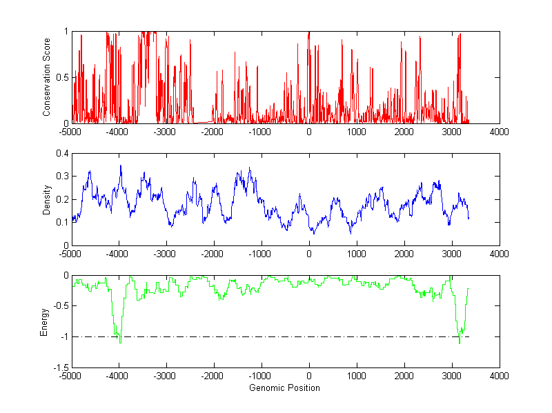 The energy profile (green curve) is about energy for module detection based on TF interaction. The positions with energy less than -1 indicate the existence of CRMs.