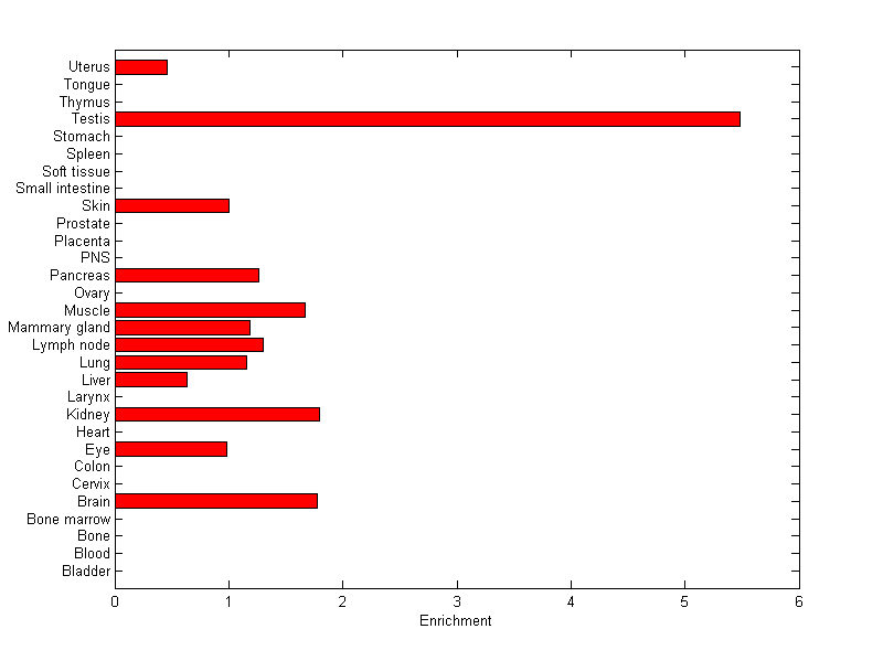 The expression level is normalized with tissue-library size. Each value for a gene in a tissue is a ratio of observed ESTs to the expected one in this tissue. The expected number of ESTs is the product of total ESTs of the gene and the fraction of total ESTs in the tissue among all ESTs in 30 tissues.