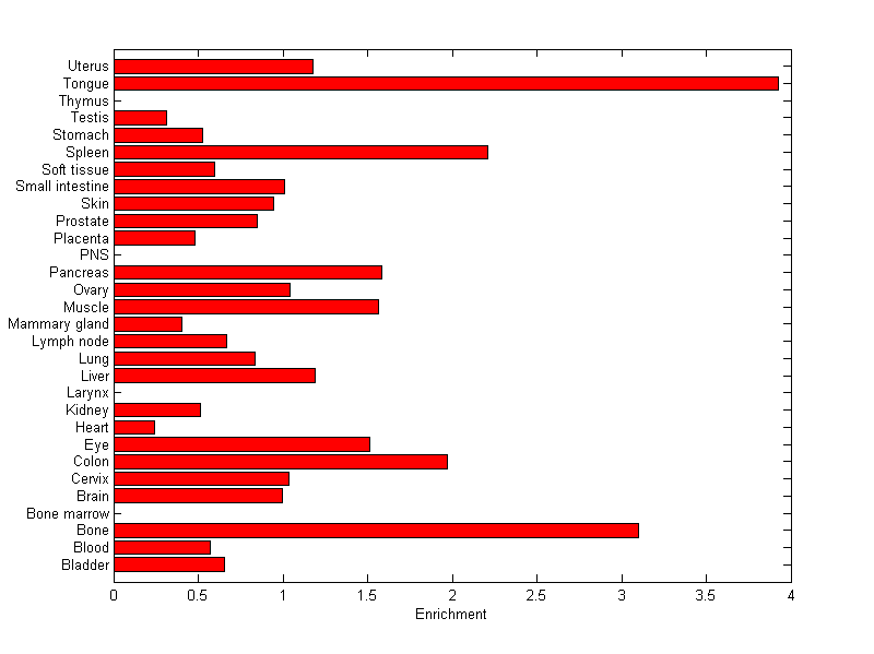 The expression level is normalized with tissue-library size. Each value for a gene in a tissue is a ratio of observed ESTs to the expected one in this tissue. The expected number of ESTs is the product of total ESTs of the gene and the fraction of total ESTs in the tissue among all ESTs in 30 tissues.
