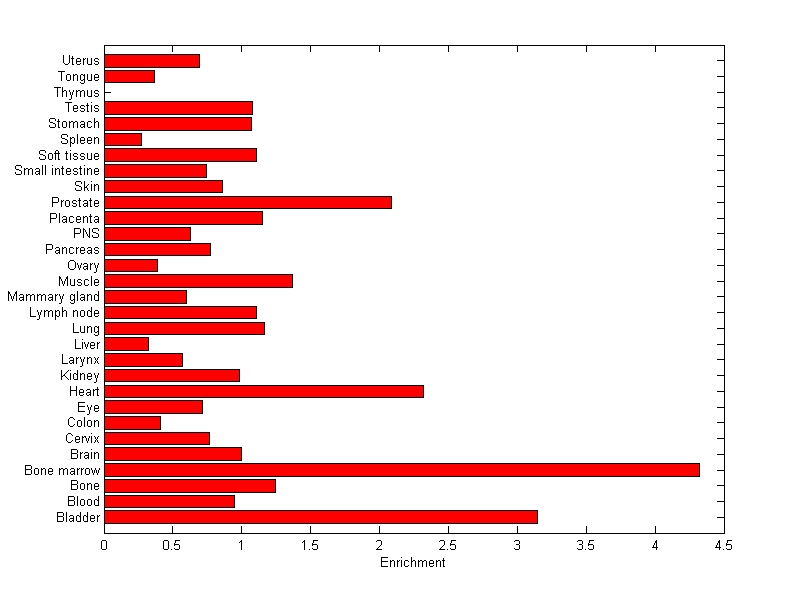 The expression level is normalized with tissue-library size. Each value for a gene in a tissue is a ratio of observed ESTs to the expected one in this tissue. The expected number of ESTs is the product of total ESTs of the gene and the fraction of total ESTs in the tissue among all ESTs in 30 tissues.