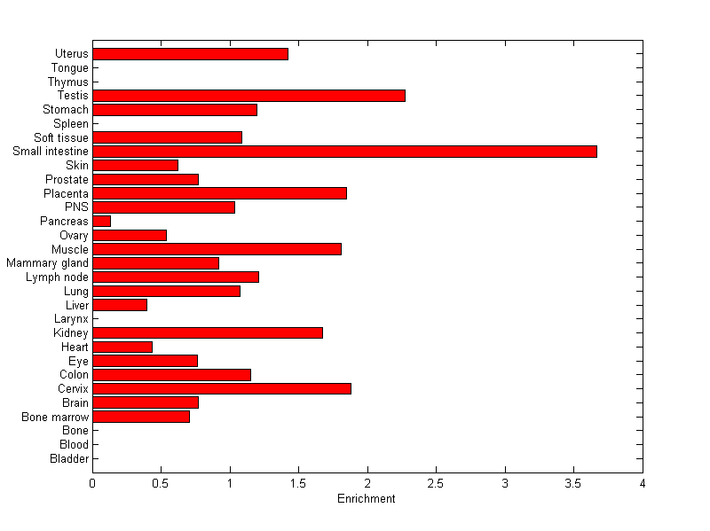 The expression level is normalized with tissue-library size. Each value for a gene in a tissue is a ratio of observed ESTs to the expected one in this tissue. The expected number of ESTs is the product of total ESTs of the gene and the fraction of total ESTs in the tissue among all ESTs in 30 tissues.