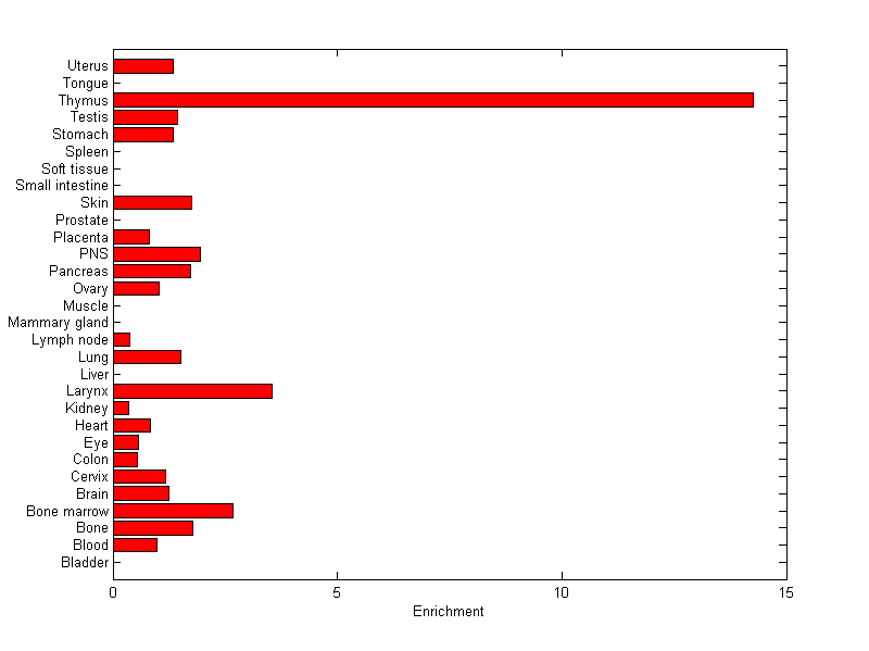 The expression level is normalized with tissue-library size. Each value for a gene in a tissue is a ratio of observed ESTs to the expected one in this tissue. The expected number of ESTs is the product of total ESTs of the gene and the fraction of total ESTs in the tissue among all ESTs in 30 tissues.