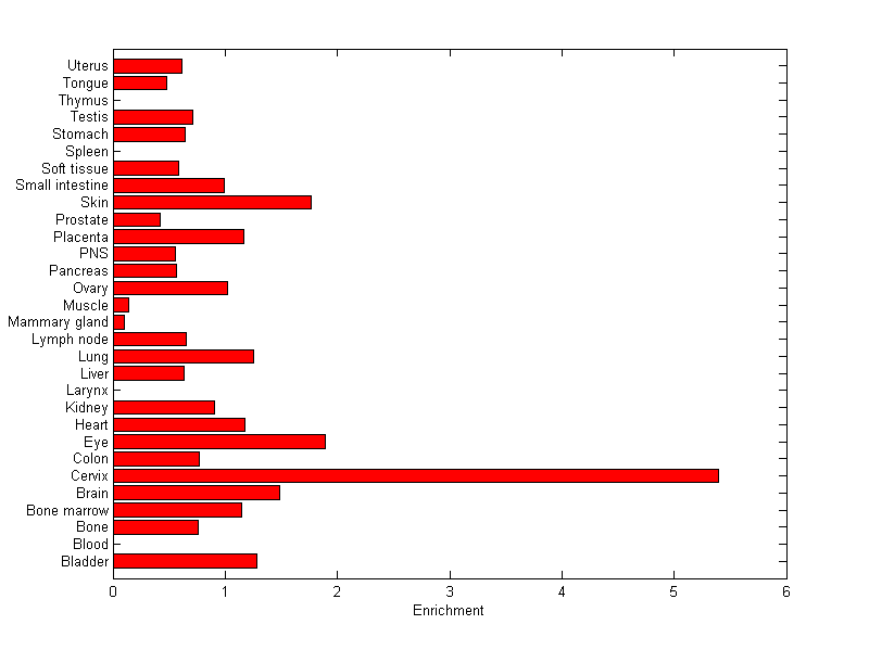The expression level is normalized with tissue-library size. Each value for a gene in a tissue is a ratio of observed ESTs to the expected one in this tissue. The expected number of ESTs is the product of total ESTs of the gene and the fraction of total ESTs in the tissue among all ESTs in 30 tissues.