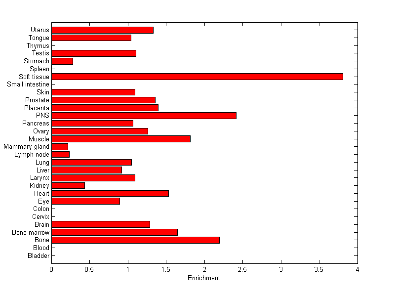 The expression level is normalized with tissue-library size. Each value for a gene in a tissue is a ratio of observed ESTs to the expected one in this tissue. The expected number of ESTs is the product of total ESTs of the gene and the fraction of total ESTs in the tissue among all ESTs in 30 tissues.